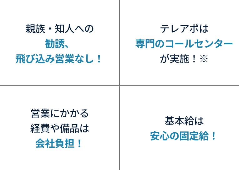 コールセンターがアポイントを取得したお客様を訪問し、ご契約内容確認活動を通じて、新たなご提案をしていただく仕事が中心です。チーム体制により、風通しの良い組織でメンバーと共に成長できる環境です。