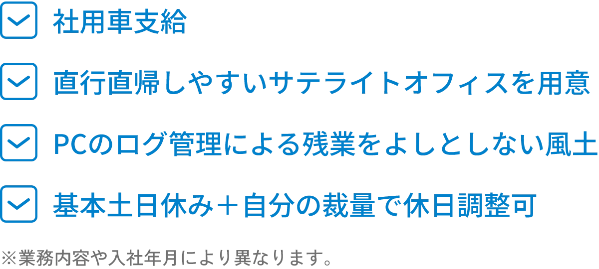 効率的な働き方や制度、環境を整えることに力をいれています。長期休暇もとりやすく、時短勤務や産休・育休もとりやすい風土です。