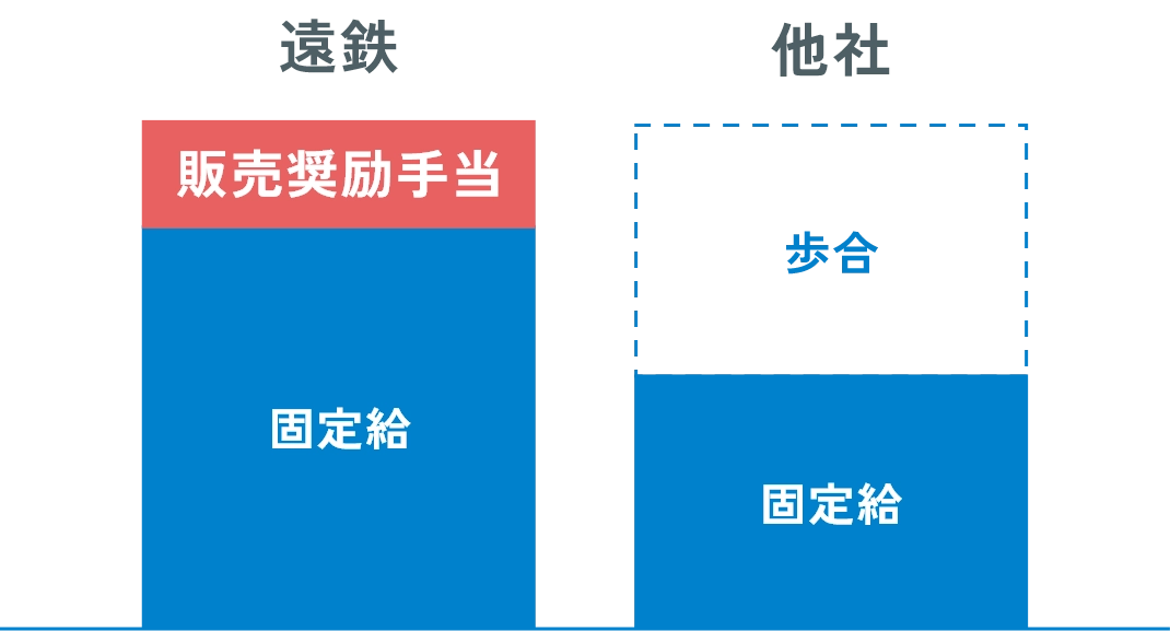 成績に応じた販売奨励手当を支給していますが、遠鉄では固定給の比率を高く設定しています。個人の頑張りを評価しながらも、しっかりとした固定給の支給で、計画的な人生設計ができる環境と、安心して働ける環境を提供しています。