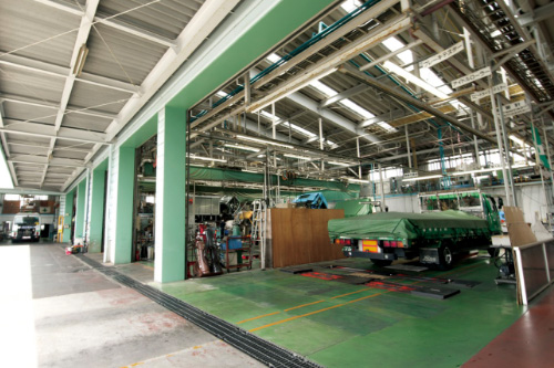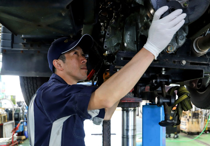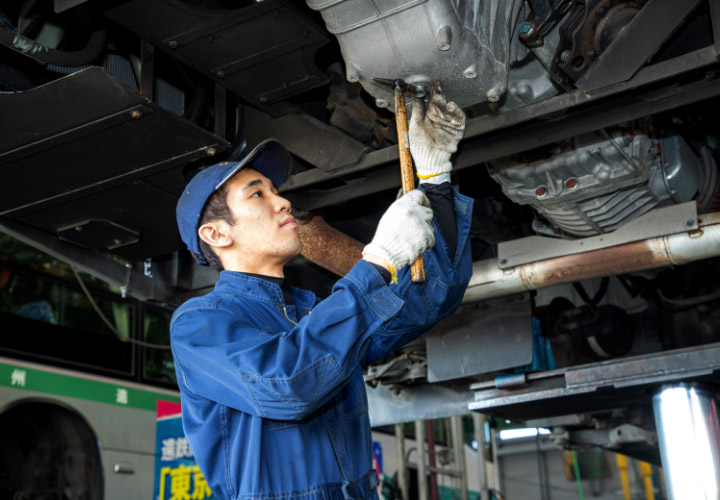 大型車用のリフトやピットを完備し、全メーカーを対象に自社バス、一般大型車、中型車、乗用車など、幅広く整備を行っています。