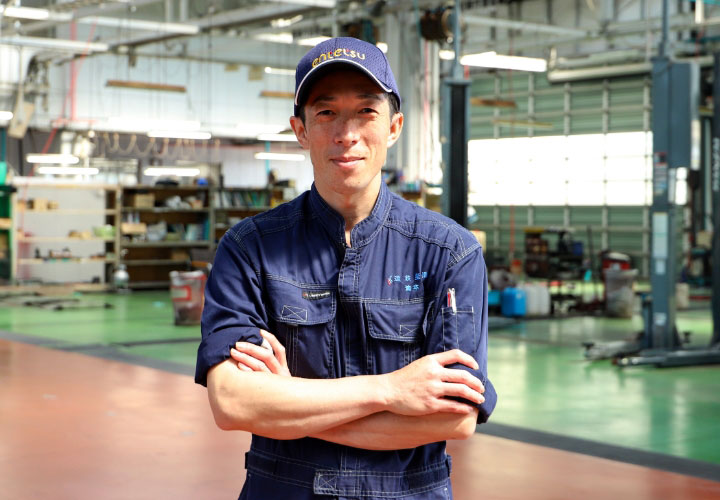 - 今は主に一般の大型車・中型車の整備を行いながら、後輩の指導にあたっています。初生の整備センターは大所帯なので、4つのチームがローテーションを組んで整備にあたっています。定期的に担当部門が入れ替わることで、全ての整備士がどのような車種でも対応できる体制を整えています。