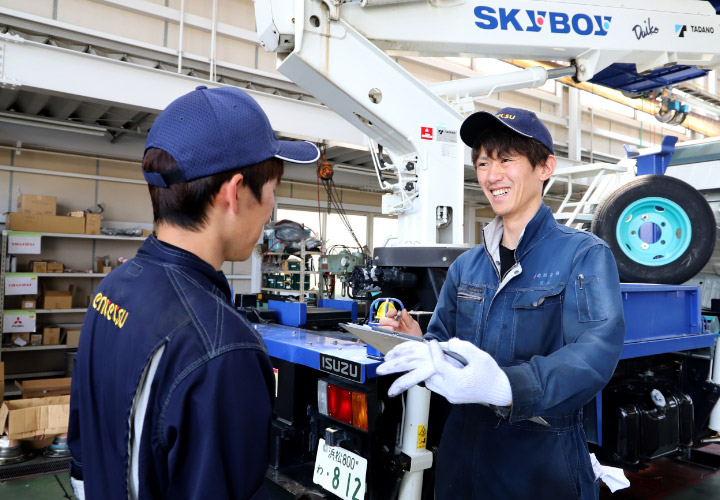 - 磐田では特に担当分野はなく、その日その日であらゆる車種の点検や整備を行っています。磐田は遠鉄バスの営業所も併設されていますので、自社バスの整備点検から一般大型車・中型車のトラブル対応、小型車のオイル交換まで、なんでもやります。